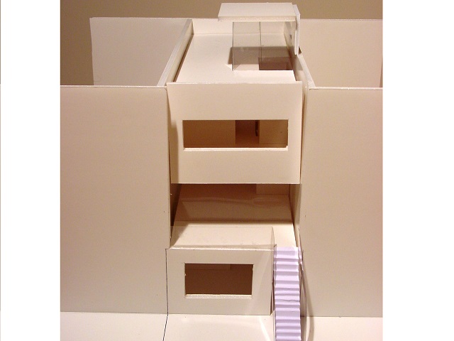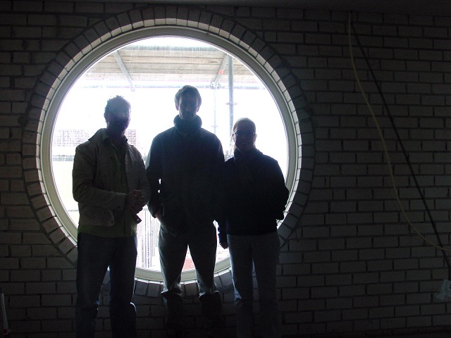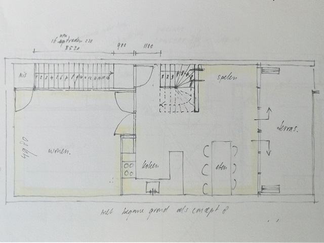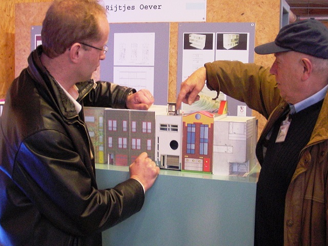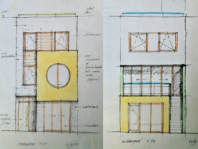 Welstandsvrij ontwerpen aan het IJ in Amsterdam. Een nieuwe buurt in het water met zelfstandige woningen, en toch in een rij. Parkeren op eigen erf, wonen op de eerste verdieping met terras achter en een groot cirkel van glas aan de straat.